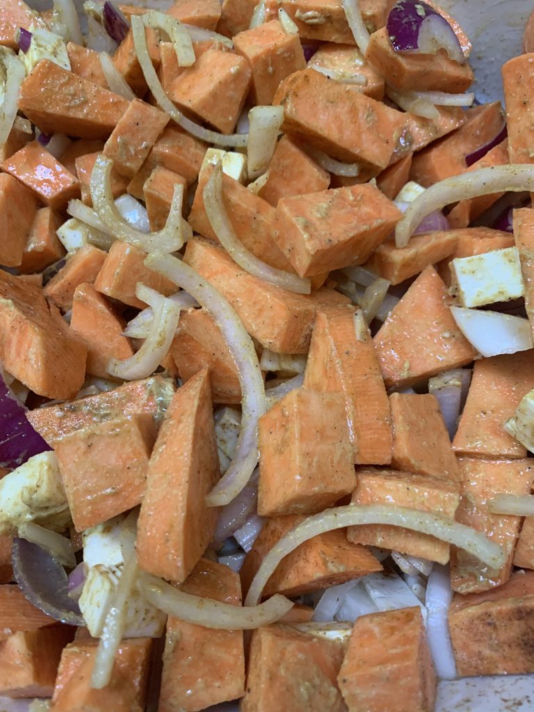 Die Süßkartoffel schälen und in Stücke oder „Pommes-Streifen“ schneiden. Sollten halt nicht zu dicke Stücke sein, sonst dauert es beim Backen zu lang. Die Zwiebel schälen und entweder kleinhacken oder in Zwiebelringe oder sonst was schneiden. Knoblauch pressen (ich schäle ihn vorher 🙂 ). Feta in Würfel schneiden (nach dem Auspacken…). Alles in eine Auflaufform geben. Gewürze nach Wunsch drüber. Eine gute Portion gutes Oliven- oder Bratöl drüber (Olivenöl ist nur bis 180C° erhitzbar). … Gut …, eine höhere Temperatur geht natürlich immer, … aber dann wird es ungesund).
