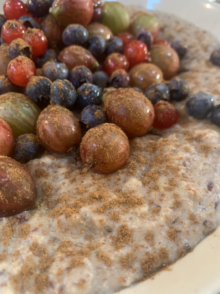 Danach die Zeit auf 5 Minuten stellen, 80-90C° einstellen und auf Stufe 2 laufen lassen. Anschließen den Nuss Porridge in eine Schüssel oder einen Teller geben, eine Handvoll frische Früchte oben drauf. Etwas Zimt drüber streuen. Fertig.