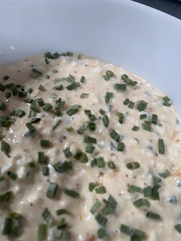 Die Eier in eine Schüssel geben und kleindrücken (zugegeben… die Eier würde ich vorher schälen 🙂 ). Dann alle übrigen Zutaten dazugeben. Gut vermischen. Abschmecken. Evtl. nachwürzen. Oben noch mal ein bisschen Schnittlauch drauf. Fertig.